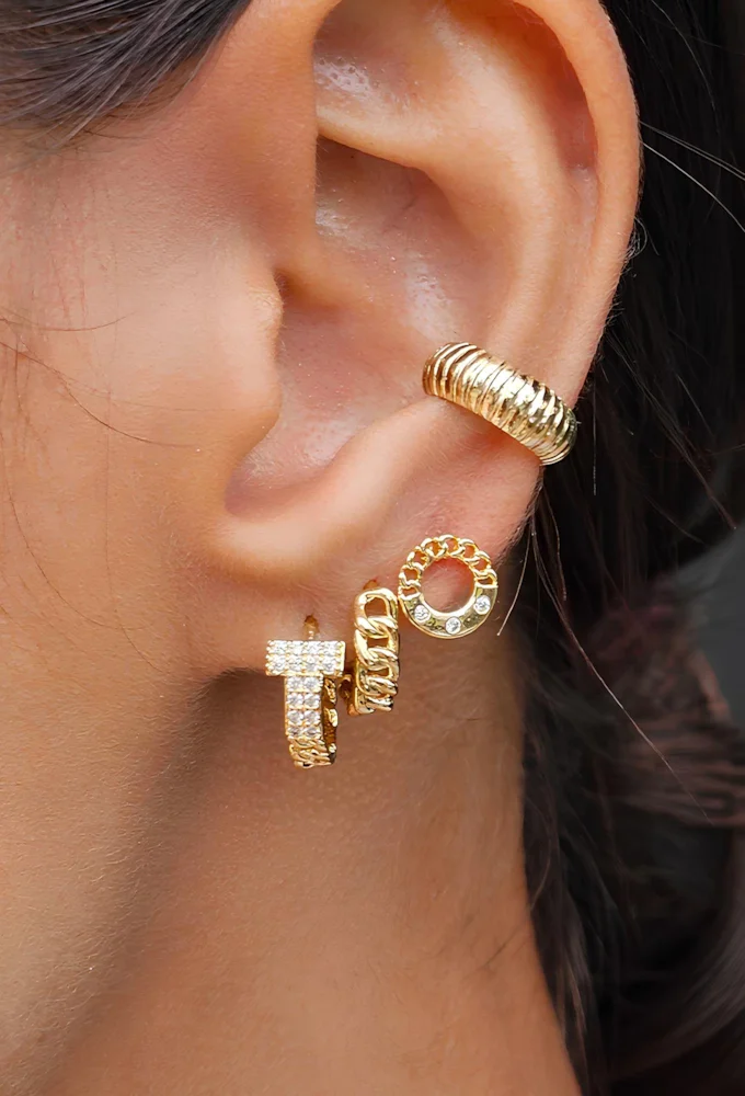 Descrição Técnica: Brinco de argolinha inspiração cravejada com elos; banho de Ouro 18k com 5 milésimos